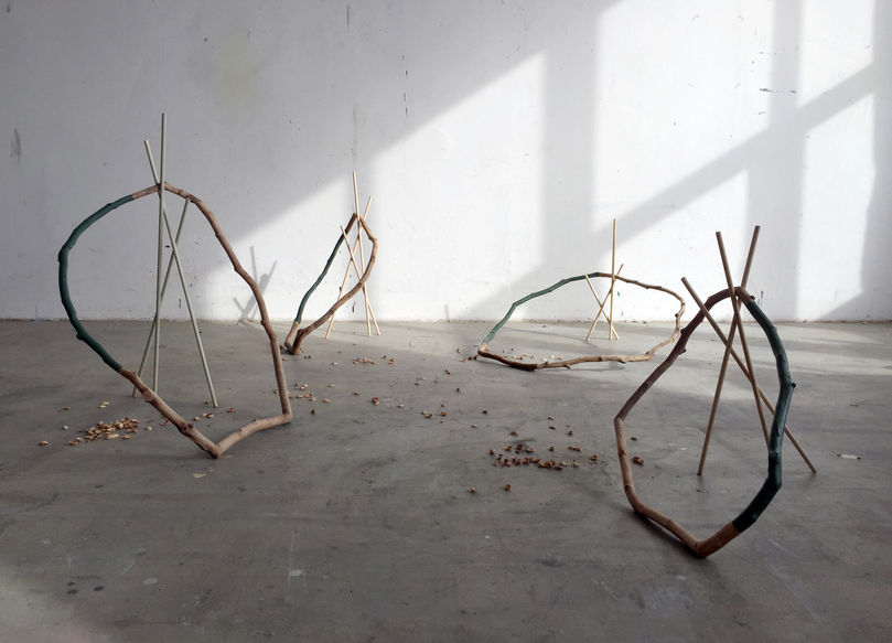 ceramic casting, copper wire, wood panel, installation